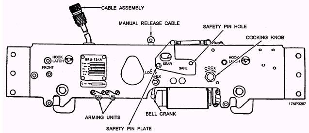 Figure 10-10.-BRU-15/A bomb rack. used with the aircraft wing store launcher assembly, which is modified to launch a Harpoon missile. You can attach Aero 1A adapter assemblies to increase the bomb rack to 30-inch suspension capacity. Because of the added Harpoon capabilities, the BRU-15/A replaces the Aero 65A as wing suspension racks for the P-3C aircraft. The BRU-15/A bomb rack is a modification of the BRU-14/A bomb rack. The functional and physical characteristics of the BRU-15/A are shown below. The IFOBRL mechanism and associated auxiliary unlock device are not included. There is a safety mechanism to positively lock the release mechanism of the bomb rack when a safety pin is installed. There is a cable-actuated manual release mechanism that operates the primary release linkage through an added manual release cable and lever. When in flight, today's high-speed fighter and attack aircraft create a vacuum under the fuselage and wings. If a weapon/store is released from the bomb rack, this vacuum can prevent the weapon/store from entering the airstream and falling to the target. If this happens, the weapon/store may physically contact the aircraft structure, causing serious damage to or loss of the aircraft. Bomb ejector racks are different from bomb racks. Bomb ejector racks use electrically fired impulse cartridges to eject the weapon/store free of the bomb racks. Bomb ejector racks eject the weapon/store from the bomb rack with sufficient force to overcome vacuum buildup and ensure a safe weapon/store launching environment. AERO 7A-5 AND AERO 7B-4 BOMB EJECTOR RACKS The Aero 7A-5 and Aero 7B-4 bomb ejector racks are mounted externally on the A-6 aircraft. All EA-6 aircraft models are equipped with an Aero 7B-4 ejector bomb rack on the centerline station and an Aero 7A-5 bomb ejector rack on the wing stations. These bomb ejector racks make up the aircraft's basic weapons suspension. They are normally referred to as parent racks. Bomb ejector racks are mounted in fairingenclosed pylons for aerodynamic purposes. The pylons have removable fairings and hinged doors for easy access to the components of the bomb ejector racks. Aero 7A-5 Bomb Ejector Rack The Aero 7A-5 bomb ejector rack assembly (fig. 10-11) consists of a housing that contains the following components: Four pairs of tandem suspension hooks A dual breech assembly Mechanical linkage connecting the hook sears to the ejector and manual release assembly An electrical junction box connecting the aircraft firing pulses to the breech Two sets of adjustable sway braces Mechanical and electrical arming units There are four separate pairs of suspension hooks on the Aero 7A-5 bomb ejector rack-two pairs for 14-inch suspension and two pairs for 30-inch suspension. The suspension hooks are self-latching, |