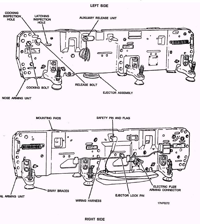 Figure 10-15.-BRU-10A/B bomb ejector rack. Once the parts have been properly cleaned, you should inspect them for damage or wear and replace or repair the parts as necessary. Before reassembling the ejector mechanism, apply a light coat of generalpurpose preservative lubricating oil (VV-L-800). To prevent the piston from locking up, you must wipe off all the excess oil. For further information concerning the Aero 7A-5 and Aero 7B-4, refer to the publication Ejector Rack Assembly Model Aero 7A-5, NAVAIR 11-5D-20. BRU-10A/B AND BRU-11A/A BOMB EJECTOR RACKS The BRU-10A/B and BRU-11A/A bomb ejector racks are used to mount and sway brace a single weapon/store or for a variety of multiple weapon/store adapters. The BRU-10A/B bomb ejector rack is pylon mounted on the wing stations of the A-7E aircraft. It is part of the aircraft's basic weapon/store suspension system. It may also be weapons-rail mounted to the F-14 aircraft fuselage. The BRU-11A/A bomb ejector rack is pylon mounted on the wing stations of the S-3 aircraft. It is part of the aircraft's basic weapon/store suspension system. BRU-10A/B Bomb Ejector Rack The BRU-10A/B bomb ejector rack (fig. 10-15) has four suspension hooks-two hooks spaced 14 inches apart and two hooks spaced 30 inches apart. It carries weapons/stores weighing up to 4,000 pounds. The bomb ejector rack has the necessary electrical connections, mechanical and electrical arming units, ejection components, and the mechanical linkage for safely suspending and ejecting weapons or stores. Although the BRU-10A/B bomb ejector rack differs from the bomb ejector racks previously discussed, the basic principles of operation are the same, except for the operations discussed in the following paragraphs. As you read them, refer to figure 10-15. A manual cocking bolt and a manual release bolt are located on the forward left-hand side of the frame assembly, Before you load a weapon or store, manually cock the mechanical linkage by rotating the cocking bolt. This places the linkage sears in a position to lock the suspension hooks when they are moved to the closed position. The suspension hooks may be released (opened) by manually rotating the manual release bolt. To prevent damage to the mechanical linkage, you must remove the safety flag assembly (safety pin) before you rotate either the cocking bolt or the release bolt.