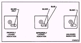 Figure 10-16.-BRU-10A/B bomb ejector rack hook latched indicators. To find out if the suspension hooks are properly Iocked, you must visually check the latch inspection holes (fig. 10-16) located in the frame assembly above each hook. If the hook is properly locked, you can see a silver latch indicator through the latching inspection hole. If the hook is not locked, you can see a blue or silver latch indicator. If the hooks are unlocked (open), the latching inspection hole will be blank. The BRU-10A/B bomb ejector rack is designed to hold one ejector assembly that can be inserted in the bomb rack in one of four different positions (fig. 10-17).