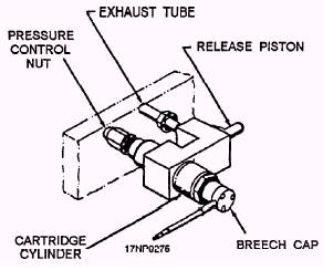Figure 10-18.-BRU-10A/B bomb ejector rack auxiliary release unit assembly. safety flag assembly prevents movement of the mechanical release mechanism assembly. The gas pressure generated by the ignition of the cartridge vents to the atmosphere through an exhaust tube on the auxiliary release unit assembly. Organizational-level maintenance is limited to cleaning, replacing, and corrosion control of damaged parts and assemblies that can be replaced without removal of the bomb rack from the aircraft. If a BRU-10A/B bomb ejector rack requires inspection or repair beyond the scope of the organizational maintenance level, route the bomb rack to the intermediate or depot maintenance level. A few of the routine maintenance requirements are discussed in the following paragraphs. After every five firings or at the end of the day's operation, whichever occurs first, the ejector assembly must be removed from the bomb ejector rack for cleaning and inspection. The actual cleaning and inspection requirements are the same as for the bomb ejector racks previously discussed. After the ejector assembly has been disassembled, cleaned, and inspected, you should lubricate the parts with a thin coat of MIL-L-19701 lubricant prior to reassembly. |