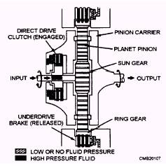 A planetary gearset (fig. 4-29) consists of three members-sun gear, ring gear, and planetary carrier which holds the planetary gears in proper relation with the sun and ring gear. The planetary gears are free to rotate on their own axis while they "walk" around the sun gear or inside the ring gear. By holding or releasing the components of a planetary gearset, it is possible to do the following: Reduce output speed and increase torque (gear reduction). Increase output speed while reducing torque (overdrive). Reverse output direction (reverse gear). Freewheel to stop power flow (park or neutral). Figure 4-30 shows the simplest application of planetary gears in a transmission. With the application shown, two forward speeds and neutral are possible. High gear or direct drive is shown. The clutch is holding the planet carrier to the input shaft, causing the carrier and sun gear to rotate as a single unit. With the clutch released, all gears are free to rotate and no power is transmitted to the output shaft. In neutral, the planetary carrier remains stationary while the pinion gears rotate on their axis and turn the ring gear. Should the brake be engaged on the ring gear, the sun gear causes the planetary gears to walk around the inside of the ring gear and force the planet carrier to rotate in the same direction as the sun gear, but at a slower speed (low gear). To provide additional speed ranges or a reverse, you must add other planetary gearsets to this transmission. A compound planetary gearset combines two planetary units into one housing or ring gear. It may have two sun gears or a long sun gear to operate two sets of planetary gears. A compound planetary gearset is used to provide more forward gear ratios than a simple planetary gearset.