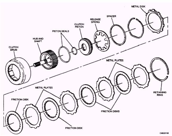 Automatic transmission clutches and bands are friction devices that drive or lock planetary gearsets members. They are used to cause the gearset to transfer power. Multiple-Disc Clutch DISCS AND PLATES.- The active components of the multiple-disc clutch are the discs and the plates. The discs are made of steel and are faced with a friction material. They have teeth cut into their inner circumference to key them positively to the clutch hub. The plates are made of steel with no lining. They have teeth cut into their outer circumference to key them positively with the inside of a clutch drum or to the inside of the transmission case. By alternately stacking the discs and plates, they are locked together or released by simply squeezing them. CLUTCH DRUM AND HUB.- The clutch drum holds the stack of discs and plates and is attached to the planetary gearset element that is being driven. The clutch hub attaches to the driving member and fits inside the clutch discs and plates.