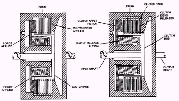Figure 4-32.- Multiple-disc clutch operation. BAND.- The brake band is a circular piece of spring steel that is rectangular in cross section. Its inside circumference is lined with a friction material. The brake band has bosses on each end so that it can be held and compressed. DRUM.- The drum fits inside of the band and attaches to the planetary gear-set element and is to be locked by the band. Its outer surface is machined smoothly to interact with the friction surface of the brake band. By pulling the open ends of the band together, the rotation of the drum stops. ANCHOR.- The anchor firmly attaches one end of the brake band to the transmission case. A provision for adjusting the clearance between the band and the drum is usually provided on the anchor. SERVO.- The servo uses hydraulic pressure to squeeze the band around the drum. The servo piston is acted on by hydraulic pressure from the valve body that is fed through an internal passage through the case. The servo piston has a seal around it to prevent leakage of hydraulic pressure and is spring loaded to allow quick
