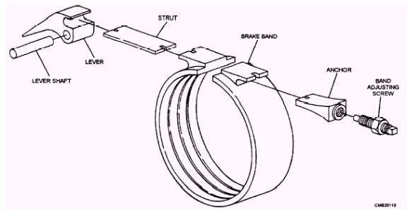 Figure 4-33.- Brake band. release of the band. Some servos use hydraulic pressure on both sides of their pistons so that they use hydraulic pressure for both the release and the application of the band. The operation of the brake band is as follows (fig. 4-34): Released- When the brake band is released, there is no hydraulic pressure applied to the servo, and the drum is free to rotate within the band. Applied- When the brake band is applied, hydraulic pressure is applied to the servo that, in turn, tightens the band around the drum. The result is that the drum is locked in a stationary position, causing an output change from the planetary gearset. In the applied circuit of a clutch or band, an accumulator is used to cushion initial application (fig. 4-35). It temporarily absorbs some of the hydraulic pressure to cause slower movement of the applied piston. |