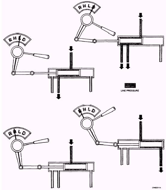 A manual valve (fig. 4-37), operated by the shift The vacuum modulator valve (fig. 4-38) is a mechanism, allows the operator to select park, neutral, diaphragm device that uses engine manifold vacuum to reverse, or different drive ranges. A manual valve is indicate engine load to the shift valve. As engine basically a multiport spool valve that switches line vacuum (load) rises and falls, it moves the diaphragm pressure to selected passages, as it is moved through its inside the modulator. This, in turn, moves the rod and operating positions. hydraulic valve to change throttle control pressure in