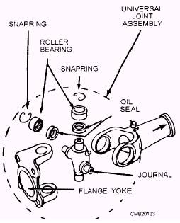 The cross and roller design is the most common type of drive shaft U-joint. It consists of four bearing caps, four needle roller bearings, a cross or journal, grease seals, and snap rings (fig. 5-5). The bearing caps are held stationary in the drive shaft yokes. Roller bearings fit between the caps and the cross to reduce friction. The cross is free to rotate inside the caps and yokes. Snap rings usually fit into grooves cut in the caps or the yoke bores to secure the bearing caps and bearings. There are several other methods of securing the bearing caps in the yokes. These are bearing covers, U-bolts, and bearing caps.