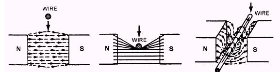Figure 1-22.- Electromagnetic induction. It can be seen now that current can be induced in a wire by three methods: 1. The wire can be moved through the stationary magnetic field (the principle applied in a dc generator). 2. The wire can be held stationary and the magnet can be moved so the field is carried past the wire (the principle applied in an ac generator). 3. The wire and electromagnet can both be held stationary and the current turned on and off to cause the magnetic field to build up and collapse so the magnetic field moves one way or the other across the wire (the principle applied in an ignition coil). |