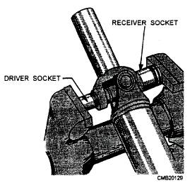 The universal joints on many automotive vehicles are factory lubricated. However, construc-tion equipment have universal joints that have lubrication fittings that should be lubricated at regular intervals. Service to universal joints that are factory lubricated is limited to replacement when signs of excessive wear are present. The universal joints provided with lubrication fittings are only lubricated with a hand operated low-pressure grease guns. Use of a high-pressure grease gun will damage the seals, resulting in early failure of the universal joint. Another area to be concerned with when servicing the universal joints is the slip yoke (joint). Slip yokes may be lubricated from the transmission or lubricated through a lubrication fitting. NOTE Always consult the manufacturer's service manual for lubrication intervals and proper lubricants to be used. A worn universal joint is the most common drive line problem, causing squeaking, grinding, clunking, or clicking sounds. The grease inside the joint can dry out. The roller bearings will wear small indentations in the cross. When the bearings try to roll over these dents, a loud metal-on-metal grinding or chirp sound can result. Quite often, a worn U-joint is discovered when the transmission is placed in REVERSE. When the vehicle is backed up, the roller bearing is forced over the wear indentation against normal rotation. When this occurs, the rollers will catch on the sharp edges in the worn joint, causing even a louder sound. UNIVERSAL JOINT DISASSEMBLY.- The universal joint may require removal and disassembly to enable you to check the condition of the joint physically. Steps for the removal and disassembly of a U-joint are as follows: 1. Raise the vehicle and place it on jack stands. CAUTION Do NOT allow the full weight of the drive shaft to hang from the slip yoke. Support the drive shaft to prevent damage to the extension housing, rear bushing, and front U-joint. 4. Wrap the tape around the caps to prevent them from falling off and spilling the roller bearings. CAUTION Wear safety glasses to protect your eyes in case the snap rings fly out of the universal joint during removal. 8. Use two sockets- one LARGER than the bearing cap and one SMALLER than the bearing cap. Place the SMALLER socket on the bearing cap of the universal joint (fig. 5-11). The LARGER socket is to be placed over the outside diameter of the bearing cap on the opposite side of the joint (fig. 5-11).