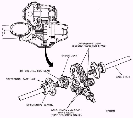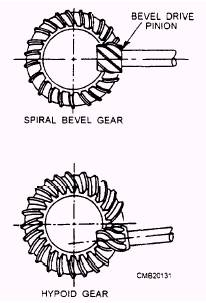 A final drive is that part of a power transmission system between the drive shaft and the differential. Its function is to change the direction of the power transmitted by the drive shaft through 90 degrees to the driving axles. At the same time. it provides a fixed reduction between the speed of the drive shaft and the axle driving the wheels. The reduction or gear ratio of the final drive is determined by dividing the number of teeth on the ring gear by the number of teeth on the pinion gear. In passenger vehicles, this speed reduction varies from about 3: 1 to 5: 1. In trucks it varies from about 5: 1 to 11: 1. To calculate rear axle ratio, count the number of teeth on each gear. Then divide the number of pinion teeth into the number of ring gear teeth. For example, if the pinion gear has 10 teeth and the ring gear has 30 (30 divided by 10), the rear axle ratio would be 3: 1. Manufacturers install a rear axle ratio that provides a compromise between performance and economy. The average passenger car ratio is 3.50: 1. The higher axle ratio, 4.11: 1 for instance, would increase acceleration and pulling power but would decrease fuel economy. The engine would have to run at a higher rpm to maintain an equal cruising speed. The lower axle ratio. 3: 1, would reduce acceleration and pulling power but would increase fuel mileage. The engine would run at a lower rpm while maintaining the same speed. The major components of the final drive include the pinion gear, connected to the drive shaft, and a bevel gear or ring gear that is bolted or riveted to the differential carrier. To maintain accurate and proper alignment and tooth contact, the ring gear and differential assembly are mounted in bearings. The bevel drive pinion is supported by two tapered roller bearings, mounted in the differential carrier. This pinion shaft is straddle mounted. meaning that a bearing is located on each side of the pinion shaft teeth. Oil seals prevent the loss of lubricant from the housing where the pinion shaft and axle shafts protrude. As a mechanic, you will encounter the final drive gears in the spiral bevel and hypoid design. as shown in figure 5-13. Spiral Bevel Gear Hypoid Gear As you can see in figure 5-13, the pinion meshes with the ring gear below the center line and is at a slight angle (less than 90 degrees). This angle and the use of heavier (larger) teeth permit an increased amount of power to be transmitted while the size of the ring gear and housing remain constant.