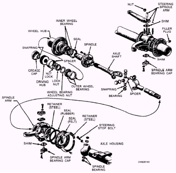 A front drive axle (fig. 5-25) is very similar to a rear drive axle; however, provisions must be made for steering the front wheels. Power is transmitted from the transfer case to the front axle by a drive shaft. The differential housing may be set off center in the axle housing to permit the drive shaft to pass beside the engine oil pan and maintain sufficient road clearance without excessive height at the front end of the vehicle. Since the front wheels must turn on the spindle arm pivots, they must be driven by the axle shaft through universal joints, which are located on the outer ends of the axles. The universal joints allow the front wheels and hubs to swivel while still transferring driving power to the hubs and wheels. The cross and roller joint shown in figure 5-25 is similar to conventional U-joints used on the rear drive shaft, and, in some cases, they are interchangeable.