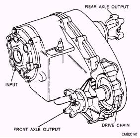 Learning Objective: Explain the operation of a transfer case. Explain basic service operations on a transfer case. Transfer cases are used in off-road vehicles to divide engine torque between the front and rear driving axles. The transfer case also allows the front driving axle to be disengaged, which is necessary to prevent undue drive line component wear during highway use. Another purpose of the transfer case is to move the drive shaft for the front driving axle off to the side so that it can clear the engine. This arrangement is necessary to allow adequate ground clearance and to allow the body of the vehicle to remain at a practical height. Figure 5-27 shows a typical drive line arrangement with a transfer case. CONVENTIONAL TRANSFER CASE