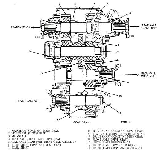 Figure 5-30.- Transfer case power flow. (splined to the transmission main shaft) are in mesh with the internal teeth on the constant mesh gear, mounted on the transmission main shaft. Likewise, the external teeth of the front axle sliding gear are in mesh with the internal teeth of the constant mesh gear or the sliding clutches are engaged. Disengagement of the drive to the front axle is accomplished by shifting the sliding gear on the front axle main shaft out of mesh with the constant mesh gear, permitting the latter to roll free on the shaft or sliding the clutches out of mesh. Low Range (fig. 5-29)- When using the low range in the transfer case, the sliding gear on the transmission main shaft is disengaged from the constant mesh gear and engaged with the idler gear on the idler shaft. This design reduces the speed by having the sliding gear mesh with the larger idler gear. The shifting linkage on some vehicles is arranged so shifting into low range is possible only when the drive to the front axle is engaged. This design prevents the operator from applying maximum torque to the rear drive only, which can cause damage. |