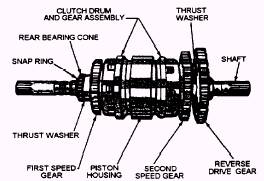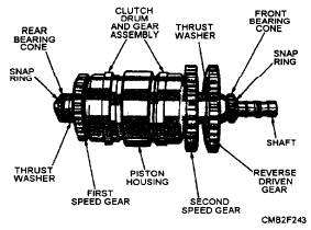 Figure 6-1.- Power shift transmission. The REVERSE CLUTCH SHAFT (fig. 6-2) has a straight roller bearing at each end, with the reverse driven gear keyed to the front of the shaft. The shaft consists of first and second speed drive gears riding on bushings and is welded to the dual hydraulic clutch pack assemblies. The FORWARD CLUTCH SHAFT (fig. 6-3) rotates on straight roller bearings at the rear and ball bearings at the front, with the reverse drive gear keyed to the front of the shaft. As with the reverse clutch shaft. the forward clutch shaft consists of first and second speed drive gears riding on bushings and is welded to the dual hydraulic clutch pack assemblies.