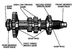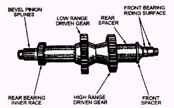 Figure 6-2.- Reverse clutch shaft. The SPLINE SHAFT (fig. 6-4) rotates on two straight roller bearings. The rear bearing is mounted in the transmission case; the front bearing is mounted in the transmission cover. The first and second driven gears are held in position on the spindle by snap rings and are constantly meshed with the first and second speed drive gears on the clutch shafts. The hi-lo driving gear slides freely on the shaft and drives the bevel pinion shaft when brought into mesh with either the high or low range driven gear by means of the hi-lo shifting lever. The BEVEL PINION SHAFT (fig. 6-5) consists of the high and low range gears, which are keyed to the shaft. The shaft is supported at the rear by a straight roller bearing, and, at the front, by a double-row taper roller bearing. The pinion gear is splined to the rear of the pinion shaft and is held in place by a nut. A shim pack is provided between the front bearing cage and the transmission case front cover for adjusting pinion depth.