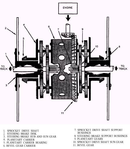 Some tracked equipment may be steered by a system that combines planetary steering and pivot brakes. The planetary steering system (fig. 6-10) differs from the one previously described in that the planetary pinion gears are two gears of different sizes, machined into one piece. Two sun gears are also included. One sun gear is splined to the sprocket pinion shaft, and the other is machined on the steering brake hub. The sun gear, machined to the steering brake hub, performs the same function as the ring gear in a conventional planetary system. Bushings are used to isolate the sprocket drive shafts and the steering brake hubs from the bevel gear carrier and the planetary carrier. Lubrication is provided from the oil sump located below the assembly. When the tracked equipment travels straight ahead, its steering brakes are held in the applied position by heavy coil springs. Braking prevents the steering brake hub and sun gear from rotating and forces the large planetary pinion gears to "walk" around the sun gear. Then power is transmitted to the sun gear on the sprocket drive shaft from the smaller planetary pinion gears. When a gradual turn is being made, the operator moves one of the steering levers back far enough to release the steering brake on one end of the planetary system. When the brake is released, the planetary pinion gears stop "walking" around the sun gear on the steering brake hub. This hub then rotates with the planetary carrier, and no power is transmitted to the sprocket drive shaft.