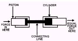 The hydrostatic drive is an automatic fluid drive that uses fluid under pressure to transmit engine power to the drive wheels or tracks. Mechanical power from the engine is converted to hydraulic power by a pump-motor team. This power is then converted back to mechanical power for the drive wheels or tracks. The pump-motor team is the heart of the hydrostatic drive system. Basically, the pump and motor are joined in a closed hydraulic loop; the return line from the motor is joined directly to the intake of the pump, rather than to the reservoir (fig. 6-11). A charge pump maintains system pressure, using supply oil from the reservoir. The hydrostatic drive functions as both a clutch and transmission. The final gear train then can be simplified with the hydrostatic unit supplying infinite speed and torque ranges as well as reverses speeds. To understand hydrostatic drive, you must understand two principles of hydraulics: Liquids have no shape of their own. Two cylinders connected by a line both filled with oil. Each cylinder contains a piston. When a force is applied to one of the pistons, the piston moves against the oil. Since the oil will not compress, it acts as a solid connection and moves the other piston. In a hydrostatic drive, several pistons are used to transmit power- one group in the PUMP sending power to another group. in the MOTOR. The pistons are in a cylinder block and revolve around a shaft. The pistons also move in and out of the block parallel to the shaft.