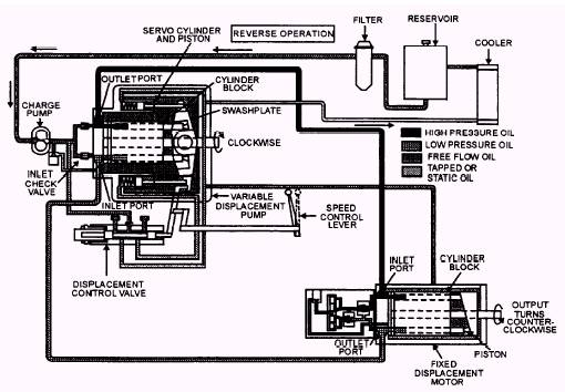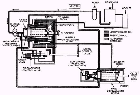 Figure 6-15.- Forward operation. As the swash plate reaches the tilt set by the speed control lever, the displacement control valve (FNR valve) spool returns to a NEUTRAL position, trapping the oil to both servo cylinders and holds the swash plate in its titled position. The swash plate will remain titled until the operator moves the speed control lever. With the pump drive shaft and cylinder block rotating clockwise and the swash plate is titled to the rear, it is now time to start pumping. As the cylinder rotates past the pump inlet port, the inlet check valve opens: oil is then forced by the charge pump into the piston bores that align with the inlet port under low charge pressure. As rotation continues, oil is forced out of the outlet port at high pressure by the pump pistons when they align with the outlet port. This flow of oil drives the motor. The distance the pistons reciprocate in and out of the cylinder block depends on the angle of the swash plate of the pump. This determines the volume of oil displaced per revolution of the pump. The greater the angle, the greater the volume and the more oil flows from the pump. As the angle of the swash plate is varied so will the volume of oil displaced from the pump. As pressure oil enters the inlet port of the motor, the pistons that align with the inlet port pushes against the swash plate. Since the fixed swash plate is always tilted, the pistons slide down the inclined surface and the resulting forces rotate the cylinder block. This, in turn. rotates the output shaft driving the machine forward. As the cylinder block continues to rotate clockwise, oil is forced out the outlet port at low pressure and returns to the pump where it is recirculated through the pump and back to the motor. This is called a "closed system" because the oil keeps circulating between the pump and the motor. The only extra oil comes from the charge pump that maintains a given flow of oil through the system whenever the machine is running. A shuttle valve, located in the motor manifold and controlled by high oil pressure, prevents high oil pressure from entering the low-pressure side of the system. This action keeps the charge circuit open to the low-pressure valve while the system is running. The high-pressure relief valve, located in the motor manifold, monitors the pressure of the forward flow of oil and protects the system from too high pressures. If pressure exceeds the rated psi, a relief valve opens and oil bypasses the cylinder block in the motor. This will either slow or stop the machine. The bypassed oil returns to the pump. This action continues until the load is reduced below the rated psi. Then the relief valve closes and oil again flows to the cylinder block, moving the machine forward. NEUTRAL (fig. 6-16).- With the speed control lever in neutral, free oil flows from the reservoir through the oil filter to the charge pump. The charge pump pumps the oil past the high charge pressure control valve and into the main pump housing. The oil circulates through the housing and returns through the oil cooler and back to the reservoir. Trapped oil is held in the cylinder block of the pump, in the motor, and in the connecting lines between the pump and motor by two check valves in the pump end cap. When the control lever is in neutral, the swash plate in the pump is also in neutral and the pistons within the pump are not pumping. Therefore no oil is being moved to provide either forward or reverse motion. The cylinder block in the pump rotates in a clockwise direction and is driven by the engine of the equipment. Rotation is viewed from the drive shaft end of the pump. Because the oil is not being pumped to the motor, the cylinder block in the motor is stationary and the output shaft does not move. NOTE With the drive system in neutral, the high charge pressure control valve, (located at the charge pump) controls pump pressure. When the system is activated for reverse or forward, the low charge pressure control valve located in the motor manifold controls the charge pressure at a lower psi. REVERSE (fig. 6-17).- As the speed control valve is moved to reverse, the spool in the displacement control valve (FNR valve) moves out of neutral allowing pressure oil to flow into the lower servo cylinder, tilting the swash plate forward. When the swash plate reaches its desired tilt, which is set by the control lever, the displacement control spool returns to neutral. This action traps the