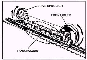 The track frame, as the name implies, serves as a framework and support for the track assembly, rollers, front idler, recoil spring, and adjusting mechanism. Track frame alignment may be fixed or shim adjusted depending on the manufacturer. When shims are used, there are a couple of ways alignment may be maintained. One way is using shims where the frame attaches to the rear pivot and also near the center of the track frame where it is mounted against the main frame guide brackets. Another way is to use a diagonal brace and shims at the rear pivot to align the track frame. Track Frame Rollers Carrier rollers (fig. 6-24) are single-flanged rollers mounted on brackets, which extend above the track frame and supports the track assembly. Two of these rollers are on each side of the tractor. The flange extends upward between the links of the track chain. keeping the chain in alignment between the drive sprocket and the front idler. Track rollers (fig. 6-25) are double-and single-flanged rollers that supports the weight of the tractor, ensures that the track chain is aligned with the track frame at it passes under the rollers, and prevents side to side track movement and derailment. In a normal arrangement, a double-flanged roller is directly in front of the drive sprocket, followed by a single-flanged roller. The rollers alternate forward to the front idler. The front idler, as shown in figure 6-25, serves as a guiding support for the track chain. The idler is spring-loaded and mounted on slides or guides that allow it to move back and forth inside the track frame, as the tractor passes over uneven terrain. The spring loading effect causes the idler to maintain the desired tension regardless of operating conditions.