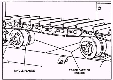 Figure 6-24.- Track carrier rollers. Recoil Spring tractors have manual adjustments, whereas newer tractors are adjusted hydraulically with a grease gun. Grease is pumped into the yoke cylinder and extends it until enough tension is placed on the recoil spring to remove the slack from the track. Tension is released by loosening the vent screw located next to the adjustment fitting. NOTE DO NOT lubricate the adjustment fitting when performing maintenance on the tractor. |