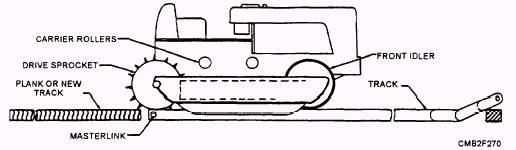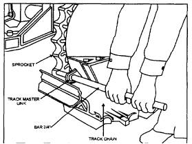 TRACK REMOVAL (fig. 6-29).- Steps for the removal of the track are as follows: 1. RELEASE TRACK TENSION. Either by manually backing off the track adjuster or loosening the vent screw on the hydraulic track adjuster. 2. REMOVE THE MASTER PIN. The master pin can be identified by a locking device or hole drilled in its end that distinguishes it from the other pins in the chain. Move the tractor backward slowly or, on some models, forward to bring the master pin just below the level of the drawbar. Place a block under the grouser on a shoe that allows the master pin to be centered on the front idler. With the master pin centered on the front idler, remove any locking device. If the master pin had a locking device, the pin can be removed by using a sledgehammer and a soft metal driftpin. Should the pin be drilled, a portable press must be used to remove the pin. Do not lose the bushings, which may drop out with the pin. 3. REMOVE THE TRACK FROM THE CARRIER ROLLERS AND IDLER. Slowly move the tractor forward or backward away from the loose ends of the track. Make sure no one is in the way of the tractor or the loose end of the track when it falls off the sprocket or front idler. 4. MOVE THE TRACTOR OFF THE TRACK. Place a plank at the rear of the track. The plank should be about the same thickness as the track, yet narrow enough to fit between the track frame and guards, and long enough so that the entire tractor can rest on the plank. NOTE Anytime a track is removed, thoroughly inspect the track frame components for excessive wear and misalignment. Removal, disassembly, and replacement vary by model and manufacturer. Consult the manufacturer's service manual for exact procedures. REPLACING TRACKS.- To replace the tracks, back the tractor off the plank and onto the new tracks so the drive sprocket properly meshes with the track rail. Continue backing until the tractor is just ahead of the rear end of the track. Then place a bar in the track (fig. 6-30), and help the track climb over the sprocket, carrier rollers, and idler as the tractor is driven forward. When the track comes together, install the master pin and any locking device. Once the track is together, adjust the track tension using the manufacturer's recommended procedures.