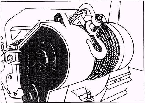 Learning Objective: Describe the operation of a winch. Identify the characteristics and maintenance of wire rope. Using a winch and some type of rigging, a vehicle can pull itself or another vehicle through such obstacles as muddy or rough terrain. This is the primary reason for providing winches on military vehicles. In the Naval Construction Force (NCF), an in-depth management program for maintenance and use of all rigging gear is required to ensure all operations are performed safely and professionally. These guidelines are outlined in the COMSECOND/ COMTHIRDNCBINST 11200.11, Use of Wire Rope Slings and Rigging Hardware in the Naval Construc-tion Force and the NAVFAC P-307, Management of Weight Handling Equipment. WINCHES The jaw-clutch winch consists of a worm gear that is keyed to a shaft. A bushed drum is mounted on the worm-gear shaft, which is controlled by a hand-operated sliding clutch. The worm shaft is driven by power from the power takeoff through a solid drive shaft and universal joints. The universal joint yoke, connected to the worm shaft of the winch, has a provision for a shear pin that is made of mild steel. This pin has a predetermined breaking strength that allows it to shear when the winch is overloaded. A hand-operated sliding clutch is keyed to the worm-gear shaft outside of the winch drum and must be engaged with the jaws on the side of the winch drum when the winch is to be operated. Disengagement of the sliding clutch permits the drum to turn on the worm-gear shaft.