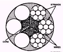 Figure 6-33.- Composition of wire rope. CAUTION Composition of Wire Rope WIRE.- The basic component of the wire rope is the wire. The wire may be made of steel, iron, or other metal in various sizes. The number of wires to a strand varies, depending on the purpose for which the wire rope is intended. The number of strands per rope and the number of wire per strand designate wire rope. Thus a 1/ 2-inch 6 x 19 rope has six strands with nineteen wires per strand. It has the same outside diameter as a 1/ 2-inch 6 x 37 rope that has six strands with thirty-seven wires (of a smaller size) per strand. STRAND.- The design arrangement of a strand is called the construction. The wires in the strand may be all the same size or a mixture of sizes. The most common strand constructions are Ordinary, Seale, Warrington, and Filler (fig. 6-34) as follows: ORDINARY construction wires are all the same size.