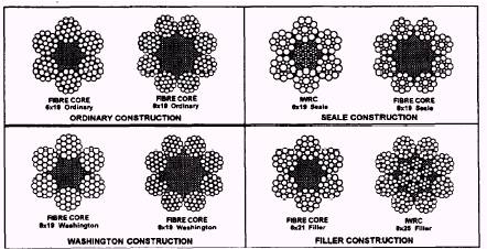 Figure 6-34.- Common strand construction. WARRINGTON is where alternate wires are large and small to combine great flexibility with resistance to abrasion. FILLER is where very small wires fill in the valleys between the outer and inner rows of wires to provide good abrasion and fatigue resistance. CORE.- The wire rope core supports the strands laid around it. The three types of wire rope cores are fiber, wire strand, and independent wire rope (fig. 6-35). A fiber core may be a hard fiber, such as manila hemp, plastic, paper, or sisal. The fiber core offers the advantage of increased flexibility. It also serves as a cushion to reduce the effects of sudden strain and acts as an oil reservoir to lubricate the wire and strands (to reduce friction). Wire rope with a fiber core is used when flexibility of the rope is important. A wire strand core resists more heat than a fiber core and also adds about 15 percent to the strength of the rope; however, the wire strand core make the wire less flexible than a fiber core. An independent wire rope core is a separate wire rope over which the main strands of the rope are laid. This core strengthens the rope, provides support against crushing, and supplies maximum resistance to heat. |