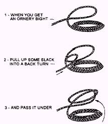 To render safe, dependable service over a maximum period of time, you should take good care and upkeep that is necessary to keep wire rope in good condition. Various ways of caring for and handling wire rope are described below. COILING AND UNCOILING.- Once a new reel has been opened, it may be coiled or faked down, like line. The proper direction of coiling is counterclockwise for left lay and clockwise for right lay wire rope. Because of the general toughness and resilience of wire, it tends now and then to resist being coiled down. When this occurs, it is useless to fight the wire by forcing down the turn because it will only spring up again. But if it is thrown in a back turn, as shown in figure 6-39, it will lie down properly. A wire rope, when faked down, will run right off, like line; but when wound in a coil, it must always be unwound.