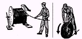 A good method for unreeling wire rope is to run a pipe or rod through the center and mount the reel on drum jacks or other supports so the reel is off the ground, as shown in figure 6-40. In this way, the reel will turn as the rope is unwound, and the rotation of the reel helps keep the rope straight. During unreeling, pull the rope straightforward, and avoid hurrying the operation. As a safeguard against kinking, NEVER unreel wire rope from a reel that is stationary.
