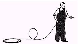 To uncoil a small coil of wire rope, simply stand the coil on edge and roll it along the ground like a wheel, or hoop, as also shown in figure 6-40. NEVER lay the coil flat on the floor or ground and uncoil it by pulling on the end, because such practice can kink or twist the rope.