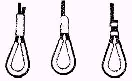Figure 6-57.- Swaged connections. The manufacturer's recommendations should be followed in determining the safe working loads of the various sizes and types of specific and identifiable hooks. All hooks for which no applicable manufacturer's recommendations are available should be tested to twice the intended safe working load before they are initially put into service. Mousing is a technique often used to close the open section of a hook to keep slings, straps, and similar attachments from slipping off the hook, as shown in figure 6-58. Hooks may be moused with rope yarn, seizing wire, or a shackle. When using rope yam or wire, make 8 to 10 wraps around both sides of the hook. To finish off, make several turns with the yarn or wire around the sides of the mousing, and then tie the ends securely. Two types of shackles used in rigging are the anchor (fig. 6-59) and the chain (fig. 6-60). Both are available with screw pins or round pins. Shackles should be used in the same configuration as they were manufactured. All pins must be straight and cotter pins must be used or all screw pins must be seated. When the original pin is lost or does not fit properly, do not use the shackle. Never replace the shackle pin with a bolt. A shackle should never be pulled from the side. This causes the shackle to bend reducing its capacity tremendously. Always attach a screw pin shackle with the screw pin on the dead end of the rope. If placed on the running end, the movement of the rope may loosen the pin.