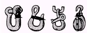 Figure 6-56.- Twin-base wire rope clip. HOOKS AND SHACKLES.- Hooks and shackles are handy for hauling or lifting loads without tying them directly to the object with line, wire rope, or chain. They can be attached to wire rope, fiber line, blocks, or chains. Shackles should be used for loads too heavy for hooks to handle. When hooks fail due to overloading, they usually straighten out and lose or drop their load. When a hook has been bent by overloading, it should NEVER be straightened and put back into service. It should be cut in half with a cutting torch and discarded. Hooks should be inspected at the beginning of each workday and before lifting a full-rated load. If you are not sure a hook is strong enough to lift the load, by all means use a shackle. Hooks that close and lock should be used where there is a danger of catching on an obstruction, particularly in hoisting buckets, cages, or skips, and especially in shaft work. Hooks and rings used with a chain should have about the same strength as the chain.