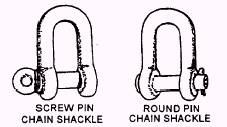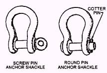 Shackles are moused whenever there is a chance of the shackle pin working loose and coming out due to vibration. To mouse a shackle, simply take several turns with seizing wire through the eye of the pin and around the bow of the shackle. Refer to figure 6-58 for proper mousing. |