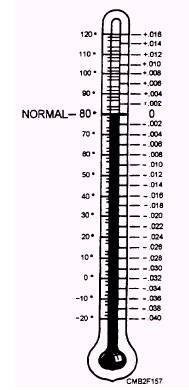 Stiff ridges or ribs are molded in the bottom of the case to form a support for the plates and a sediment recess for the flakes of active material that drop off the plates during the life of the battery. The sediment is thus kept clear of the plates so it will not cause a short circuit across them. The battery cover is made of the same material as the container and is bonded to and seals the container. The cover provides openings for the two battery posts and a cap for each cell. Battery caps either screw or snap into the openings in the battery cover. The battery caps (vent plugs) allow gas to escape and prevent the electrolyte from splashing outside the battery. They also serve as spark arresters (keep sparks or flames from igniting the gases inside the battery). The battery is filled through the vent plug openings. Maintenance-free batteries have a large cover that is not removed during normal service. CAUTION Hydrogen gas can collect at the top of a battery. If this gas is exposed to a flame or spark, it can explode. BATTERY TERMINALS.- Battery terminals provide a means of connecting the battery plates to the electrical system of the vehicle. Either two round post or two side terminals can be used. Battery terminals are round metal posts extending through the top of the battery cover. They serve as connections for battery cable ends. Positive post will be larger than the negative post. It may be marked with red paint and a positive (+) symbol. Negative post is smaller, may be marked with black or green paint, and has a negative (-) symbol on or near it. Side terminals are electrical connections located on the side of the battery. They have internal threads that accept a special bolt on the battery cable end. Side terminal polarity is identified by positive and negative symbols marked on the case. ELECTROLYTE. -The electrolyte solution in a fully charged battery is a solution of concentrated sulfuric acid in water. This solution is about 60 percent water and about 40 percent sulfuric acid. The electrolyte in the lead-acid storage battery has a specific gravity of 1.28, which means that it is 1.28 times as heavy as water. The amount of sulfuric acid in the electrolyte changes with the amount of electrical charge; also the specific gravity of the electrolyte changes with the amount of electrical charge. A fully charged battery will have a specific gravity of 1.28 at 80 F. The figure will go higher with a temperature decrease and lower with a temperature increase. As a storage battery discharges, the sulfuric acid is depleted and the electrolyte is gradually converted into water. This action provides a guide in determining the state of discharge of the lead-acid cell. The electrolyte that is placed in a lead-acid battery has a specific gravity of 1.280. The specific gravity of an electrolyte is actually the measure of its density. The electrolyte becomes less dense as its temperature rises, and a low temperature means a high specific gravity. The hydrometer that you use is marked to read specific gravity at 80 F only. Under normal conditions, the temperature of your electrolyte will not vary much from this mark. However, large changes in temperature require a correction in your reading. For EVERY 10-degree change in temperature ABOVE 80 F, you must ADD 0.004 to your specific gravity reading. For EVERY 10-degree change in temperature BELOW 80 F, you must SUBTRACT 0.004 from your specific gravity reading. Suppose you have just taken the gravity reading of a cell. The hydrometer reads 1.280. A thermometer in the cell indicates an electrolyte temperature of 60 F. That is a normal difference of 20 degrees from the normal of 80 F. To get the true gravity reading, you must subtract 0.008 from 1.280. Thus the specific gravity of the cell is actually 1.272. A hydrometer conversion chart similar to the one shown in figure 2-4 is usually found on the hydrometer. From it, you can obtain the specific gravity correction for temperature changes above or below 80 F.