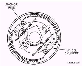 Figure 7-8.- Double-anchor, double-wheel cylinder configuration. used where a flexing action is required. For example, a brake hose is used between the frame and the front-wheel cylinders or disc brake calipers. This design allows the wheels to move up and down, as well as side to side without damaging the brake line. Figure 7-9 shows the details of how brake lines and brake hoses fit together. A junction block is used where a single brake line must feed two wheel cylindersorcalipers. It is a simply a hollow fittingwith one inlet and two or more outlets. Mounting brackets and clips are used to secure brake lines and hoses to the unibody or frame of the vehicle. The mounting brackets help hold the assemblies secure and reduce the vibration which causes metal fatigue, thereby preventing line breakage.