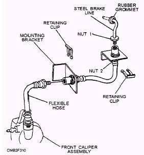 Figure 7-9.- Brake lines and hoses. Steel lines seldom need replacing except in areas where they rust from exposure to salt air or constant high humidity. Flexible hoses should be inspected at regular maintenance periods for any signs of cracking or abrasion. Should the outer protective covering be cracked or badly abraded, it should be replaced. |
