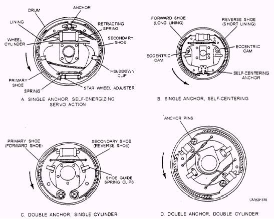Figure 7-15.- Brake drum configurations. consequent marked reduction in the distance required to stop the vehicle. Braking with disc brakes is accomplished by forcing friction pads against both sides of a rotating metal disc, or rotor. The rotor turns with the wheel of the vehicle and is straddled by the caliper assembly. When the brake pedal is depressed, hydraulic fluid forces the pistons and friction linings (pads) against the machined surfaces of the rotor. The pinching action of the pads quickly creates friction and heat to slow down or stop the vehicle. Disc brakes do not have servo or self-energizing action. Therefore, the applying force on the brake pedal must be very great in order to obtain a brake force comparable to that obtained with the conventional drum brake. Consequently, disc brakes are provided with a power or booster unit and a conventional master cylinder. In many installations, disc brakes are used only on the front wheels and drum brakes are continued on the rear. However, you may on occasion find disc brakes used on all four wheels. |