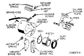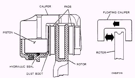 Disc brakes can be classified as floating, sliding, and fixed caliper types. Floating and sliding are the most common types. The fixed caliper may be found on older vehicles. FLOATING CALIPER.- The floating caliper type disc brake (fig. 7-17) is designed to move laterally on its mount. This movement allows the caliper to maintain a centered position with respect to the rotor. This design also permits the braking force to be applied equally to both sides of the rotor. The floating caliper usually is a one-piece solid construction and uses a single piston to develop the braking force. Operation of a floating caliper is as follows: