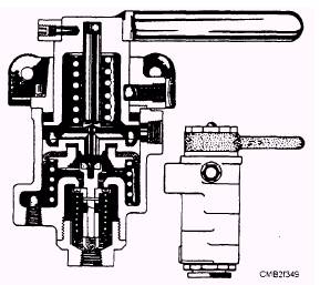 exhausted at the brake valve. As air pressure above the diaphragm is released, the air pressure below the diaphragm raises off the exhaust port. This action allows the air in the brake chambers to exhaust at the quick-release valve. When air is leaking from the system, a leakage test can determine if there is air leaking at the quick-release valve. The leakage test is performed with the brakes applied and coating the exhaust port with soapsuds. If air bubbles form, this is a sign of a defective valve, which can be corrected by either cleaning and replacing worn parts or by replacing the unit. Dirt, worn diaphragm, or a worn seat causes leakage. Combined-Limiting and Quick-Release Valve |