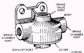 The quick-release valve (fig. 7-49) exhausts brake chamber air pressure and speeds up brake release by reducing the distance the air would have to travel back to the brake valve exhaust port. When the brakes are engaged, air from the brake valve enters into the quick-release valve, forcing the diaphragm down and closing off the exhaust port. This action allows air pressure to rush through the quick-release valve outlet ports to the wheel brake chambers. When the brakes are released, the air pressure above the quick-release diaphragm is