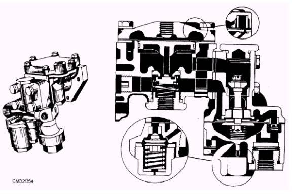 The relay emergency valve (fig. 7-53) acts as a relay station to speed up the application and release of trailer brakes. It automatically applies the trailer brakes when the emergency line of the trailer is broken, disconnected, or otherwise vented to the atmosphere if the trailer air brake system is charged. It is used on trailers that require an emergency brake application upon breakaway from the truck or tractor. When a tractor is connected to a trailer and the service and emergency lines are opened, the relay emergency valve permits charging the trailer air brake reservoir to approximately the same air pressure as that in the tractor reservoirs. During normal operation of a tractor-trailer unit, the relay emergency valve functions as a relay valve and synchronizes trailer service brake air pressure and tractor service brake air pressure, as the treadle valve on the tractor is operated. The trailer brakes can also be applied independently of the tractor brakes by use of the hand control on the tractor protection valve on the tractor and the relay emergency valve on the trailer. If a trailer is disconnected from a tractor for loading or unloading or if the trailer is separated from the tractor under emergency breakaway conditions or if the emergency line of the trailer is vented to the atmosphere by other means, the relay emergency valve applies the trailer brakes. This is automatically achieved by using the existing trailer reservoir air pressure. If the trailer is to remain parked under these conditions, the wheels should be blocked to prevent the possibility of a runaway. If you are required to release the emergency brake application on a trailer under these conditions, the trailer reservoir drain valve can be opened or the trailer air brake system can be recharged through the trailer emergency line. You can check the relay emergency valve by moving the tractor protection valve control lever to the EMERGENCY position, if tractor protection equipment is installed. If no tractor protection is