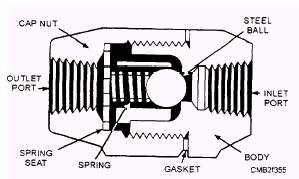 Figure 7-53.- Relay emergency valve. installed, by closing the emergency line cutout valve and uncoupling the emergency brake line, the valve can be checked. Either way the trailer brakes should apply automatically. Trailer brakes should release, in the first case, when the tractor protection valve control lever is moved to the NORMAL position, and, in the second case, when the emergency line is coupled and the cutout valve is opened. The relay emergency valve is checked for leakage by application of soapsuds with the brakes released. Check the emergency air line coupling with soapsuds to determine leakage with the valve in emergency application position. Leakage may be caused by dirt or worn parts which may be corrected by cleaning and/ or replacing the unit. Check Valves