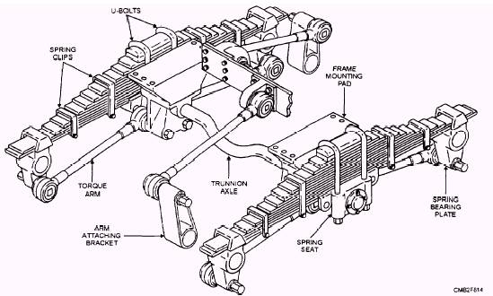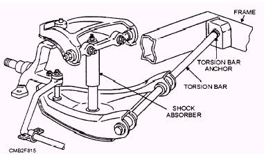 The torsion bar consists of a steel rod made of spring steel and treated with heat or pressure to make it elastic, so it will retain its original shape after being twisted. Torsion bars, like coil springs, are frictionless and require the use of shock absorbers. The torsion bar is serrated on each end and attached to the torsion bar anchor at one end and the suspension system at the other end (fig. 8-15). Torsion bars are marked to indicate proper installation by an arrow stamped into the metal. It is essential that they be installed properly because they are designed to take the stress in one direction only. The up-and-down movement of the suspension system twists the steel bar. The torque resistance will return the suspension to its normal position in the same manner as a spring arrangement.