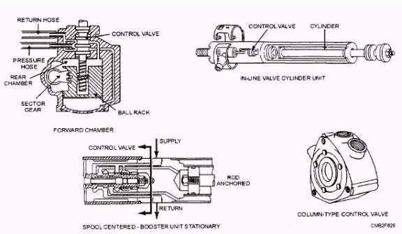 Power steering systems normally use an engine-driven pump and hydraulic system to assist steering action. Pressure from the oil pump is used to operate a piston and cylinder assembly. When the control valve routes oil pressure into one end of the piston, the piston slides in its cylinders. Piston movement can then be used to help move the steering system components and front wheels of the vehicles. The components that are common to all power steering systems are as follows: in the system. There are four basic types of power steering pumps- vane, roller, slipper, and gear types. A belt running from the engine crankshaft pulley normally powers the pump. During pump operation, the drive belt turns the pump shaft and pumping elements. Oil is pulled into one side of the pump by vacuum. The oil is then trapped and squeezed into a smaller area inside the pump. This action pressurizes the oil at the output, as it flows to the rest of the system. A pressure relief/ flow valve is built into the pump to control maximum oil pressure. This action prevents system damage by limiting pressure developed throughout the different engine speeds. POWER STEERING PUMP (fig. 8-25)- The power steering pump is engine-driven and supplies hydraulic fluid under pressure to the other components CONTROL VALVE (fig. 8-26)- The controlvalve (rotary or spool type), which is actuated bysteering wheel movements, is designed to direct the