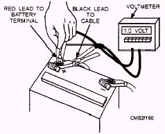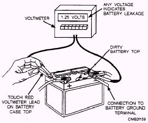 As a mechanic you will be expected to test batteries for proper operation and condition. These tests are as follows: Battery leakage test BATTERY LEAKAGE TEST.- A battery leakage test will determine if current is discharging across the top of the battery. A dirty battery can discharge when not in use. This condition shortens battery life and causes starting problems. To perform a battery leakage test, set a voltmeter on a low setting. Touch the probes on the battery, as shown in figure 2-6. If any current is registered on the voltmeter, the top of the battery needs to be cleaned. BATTERY TERMINAL TEST.- The battery terminal test quickly checks for poor electrical connection between the terminals and the battery cables. A voltmeter is used to measure voltage drop across terminals and cables. To perform a battery terminal test (fig. 2-7), connect the negative voltmeter lead to the battery cable end. Touch the positive lead to the battery terminal. With the ignition or injection system disabled so that the engine will not start, crank the engine while watching the voltmeter reading.