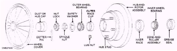 WHEEL BEARING AND HUB ASSEMBLY The two basic wheel-bearing configurations are tapered roller or ball bearing types. The basic parts of a wheel bearing are as follows: OUTER RACE (cup or cone pressed into the hub, steering knuckle, or bearing support) BALLS or ROLLERS (antifriction elements that fit between the inner and outer races) INNER RACE (cup or cone that rests on the spindle or drive axle shaft) There are two types of wheel bearing and hub assemblies- nondriving and driving. For example, the front wheels on a rear-wheel drive vehicle are nondriving. Nondriving Wheel Assembly SPINDLE- a stationary shaft extending outward from the steering knuckle or suspension system to which the following components are attached. WHEEL BEARINGS- normally tapered roller bearings mounted on the spindle and in the wheel hub. HUB- outer housing that holds the brake disc, or drum, wheel, grease, and wheel bearing. GREASE WHEEL- a seal that prevents loss of lubricant from the inner end of the spindle and hub. SAFETY WASHER- a flat washer that keeps the outer wheel bearing from rubbing on and possibly turning the adjusting nut. SPINDLE ADJUSTING NUT- a nut threaded on the end of the spindle for adjusting the wheel bearing. NUT LOCK- a thin, slotted nut that fits over the main spindle nut. DUST CAP- a metal cap that fits over the outer end of the hub to keep grease in and dirt out of the bearings. Since a nondriving wheel bearing and hub assembly does NOT transfer driving power, the