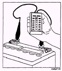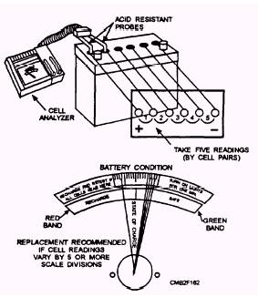 To perform a cell voltage test (fig. 2-9), use a low voltage reading voltmeter with special cadmium (acid resistant metal) tips. Insert the tips into each cell, starting at one end of the battery and work your way to the other. Test each cell carefully. If the cells are low, but equal, recharging usually will restore the battery. If cell voltage readings vary more than .2 volts, the battery is BAD.