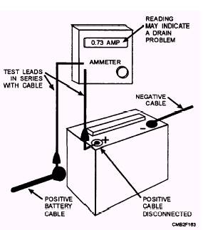 Figure 2-9.- Cell voltage test. BATTERY DRAIN TEST.- A battery drain test checks for abnormal current draw with the ignition off. If a battery goes dead without being used, you need to check for a current drain. To perform a battery drain test, set up an ammeter, as shown in figure 2-10. Pull the fuse if the vehicle has a dash clock. Close all doors and trunk (if applicable). Then read the ammeter. If everything is off, there should be a zero reading. Any reading indicates a problem. To help pinpoint the problem, pull fuses one at a time until there is a zero reading on the ammeter. This action isolates the circuit that has the problem. BATTERY CAPACITY TEST.- A battery load test, also termed a battery capacity test, is the best method to check battery condition. The battery load test measures the current output and performance of the battery under full current load. It is one of the most common and informative battery tests used today. Before load testing a battery, you must calculate how much current draw should be applied to the battery. If the ampere-hour rating of the battery is given, load the battery to three times its amp-hour rating. For example, if the battery is rated at 60 amp-hours, test the battery at 180 amps (60 x 3 = 180). The majority of the batteries are now rated in SAE cold-cranking amps, instead of amp-hours. To determine the load test for these batteries, divide the cold-crank rating by two. For example, a battery with 400 cold-cranking amps rating should be loaded to 200 amps (400 2 = 200). Connect the battery load tester, as shown in figure 2-11. Turn the control knob until the ammeter reads the correct load for your battery.