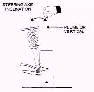 is the angle away from the vertical, formed by the inward tilt of the kingpin, ball joints, or MacPherson strut tube. Steering axis inclination is always an inward tilt regardless of whether the wheel tilts inward or outward. Steering axis inclination is NOT a tire-wearing angle. As with caster it aids directional stability by helping the steering wheel to return to the straight-ahead position.