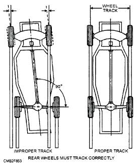 Tracking (fig. 8-53) is the ability of the vehicle to maintain a right angle between the center line of the vehicle and both front and rear axles or spindles. (The rear of the vehicle should follow the front wheels.) With improper tracking, the vehicle rear tires do NOT follow the tracks of the front tires. This causes the vehicle body or frame to actually shift partially sideways when moving down the road. Poor tracking will increase tire wear, lower fuel economy, and upset handling.